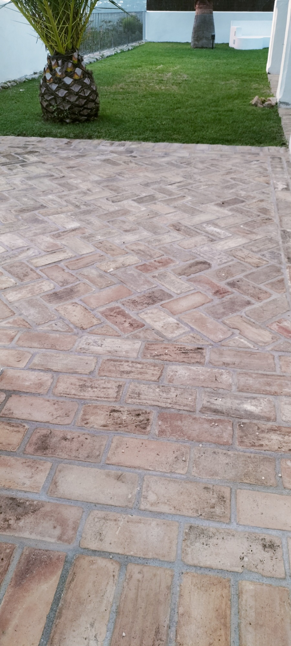 Trabado a un Tercio: El empisado se instaló siguiendo un patrón de trabajo a un tercio, lo que añade un toque visual interesante y atractivo a la terraza.
